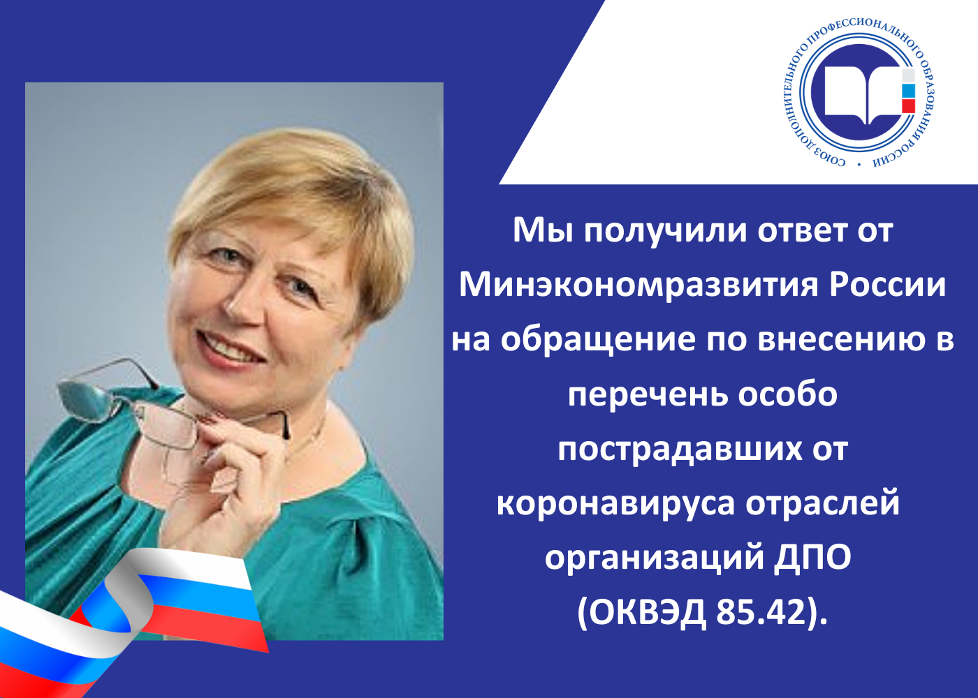 Алена Александровна Курочкина2020-11-30T08:55:18+00:00Минобрнауки России направило письмо в Минэкономразвития России, в котором сообщает, что ПОДДЕРЖИВАЕТ предлагаемое нами внесение ДПО в перечень отраслей российской экономики, в наибольшей степени пострадавших от распространения новой коронавирусной инфекции, утвержденный постановлением Правительства Российской Федерации от 03.04.2020 №434. Письмо Минобрнауки России в Минэкономразвития России Ответ Минобрнауки России [...]
