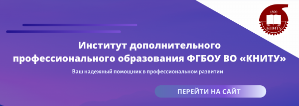 Институт дополнительного профессионального образования ФГБОУ ВО «Казанский национальный исследовательский технологический университет» более 20 лет является деятельным и востребованным участником сферы дополнительного образования и профессионального обучения с высоким репутационным рейтингом. В нашем арсенале современные программы и актуальные образовательные технологии по самым разнообразным направлениям. Наша деятельность осуществляется в соответствии с ориентирами национальных проектов «Образование» и «Демография», позволяя различным категориям граждан – лицам предпенсионнного возраста, женщинам, имеющим малолетних детей, безработным ищущим занятости или желающим изменить профессиональную траекторию, а также руководителям и специалистам разного профиля обеспечивать свое непрерывное образование.